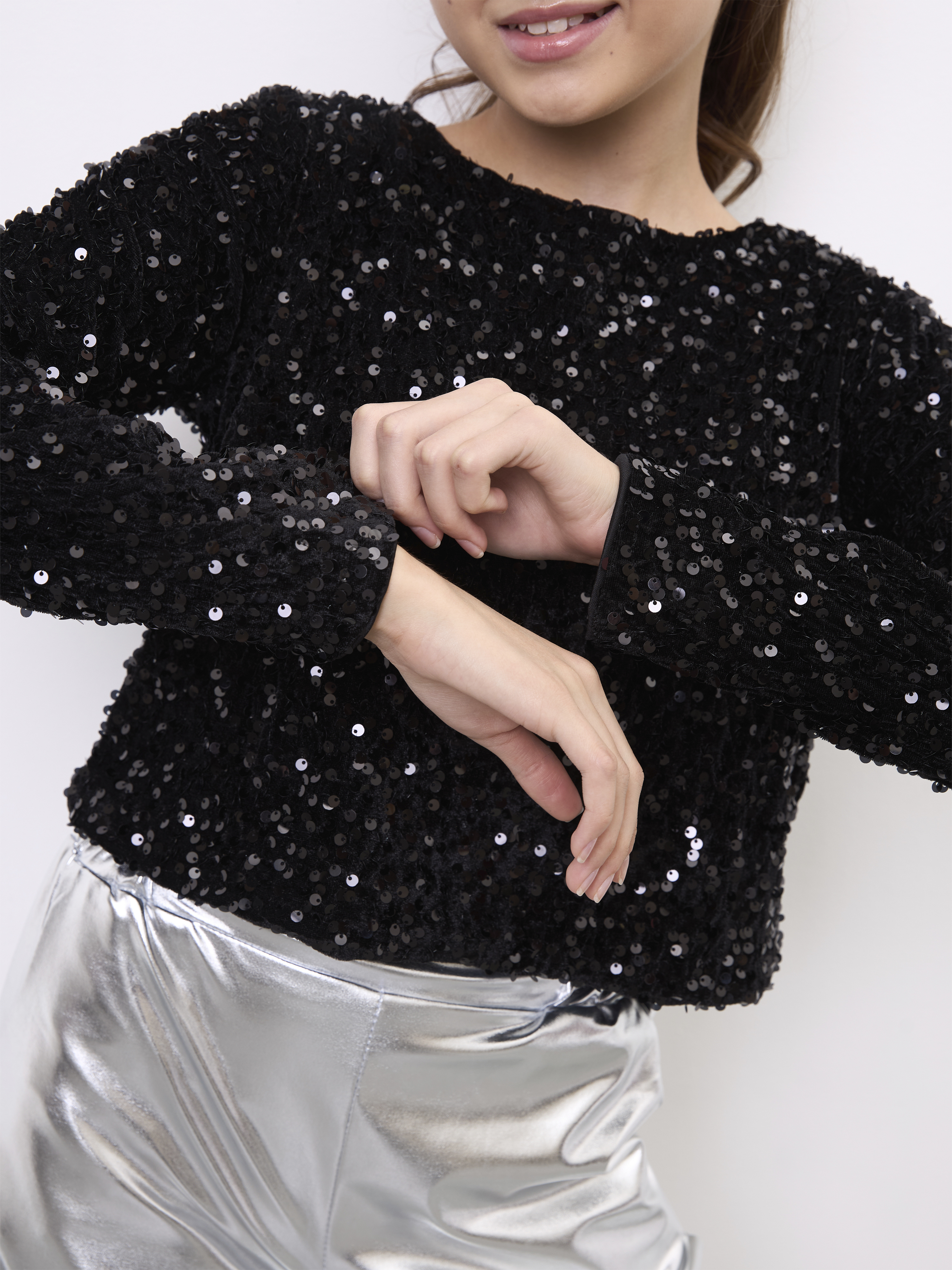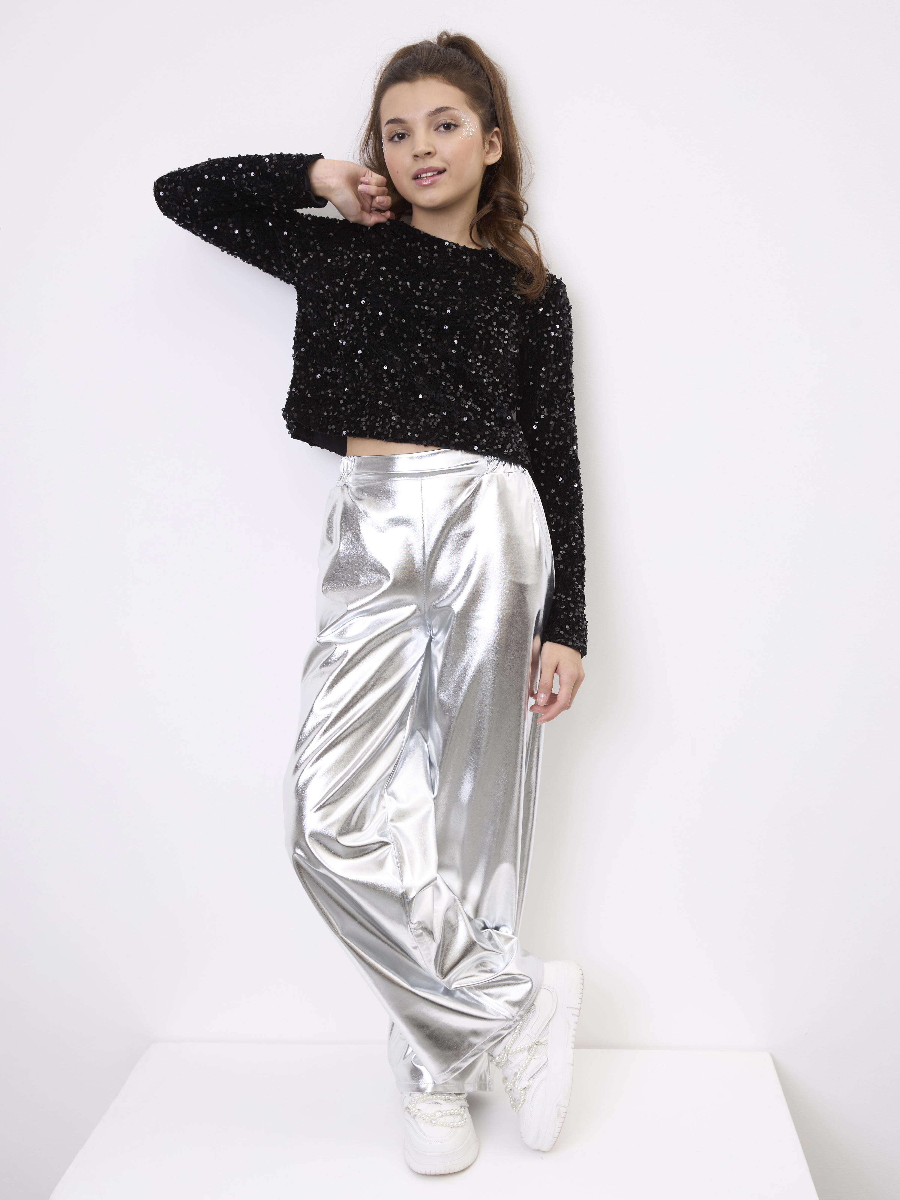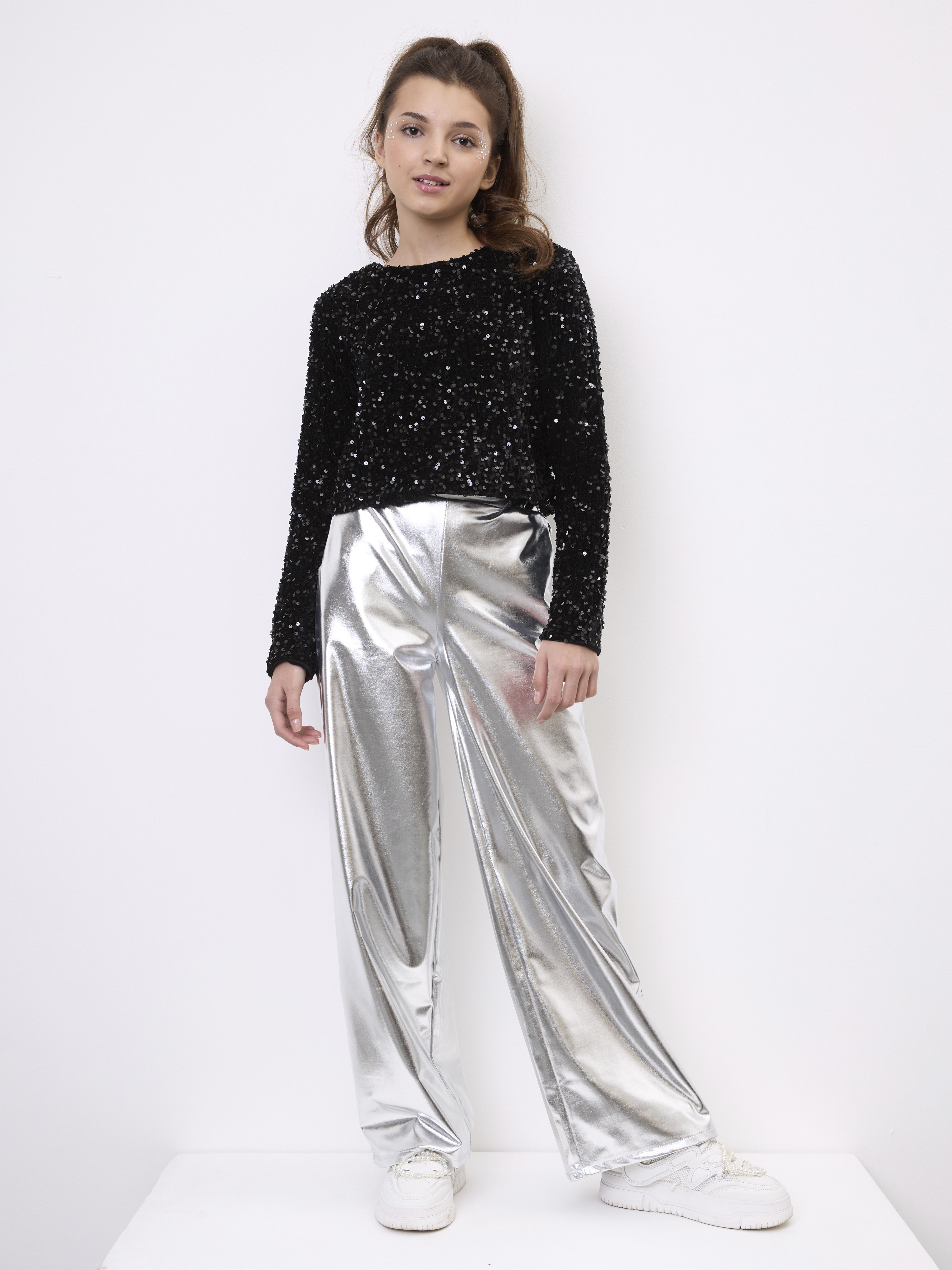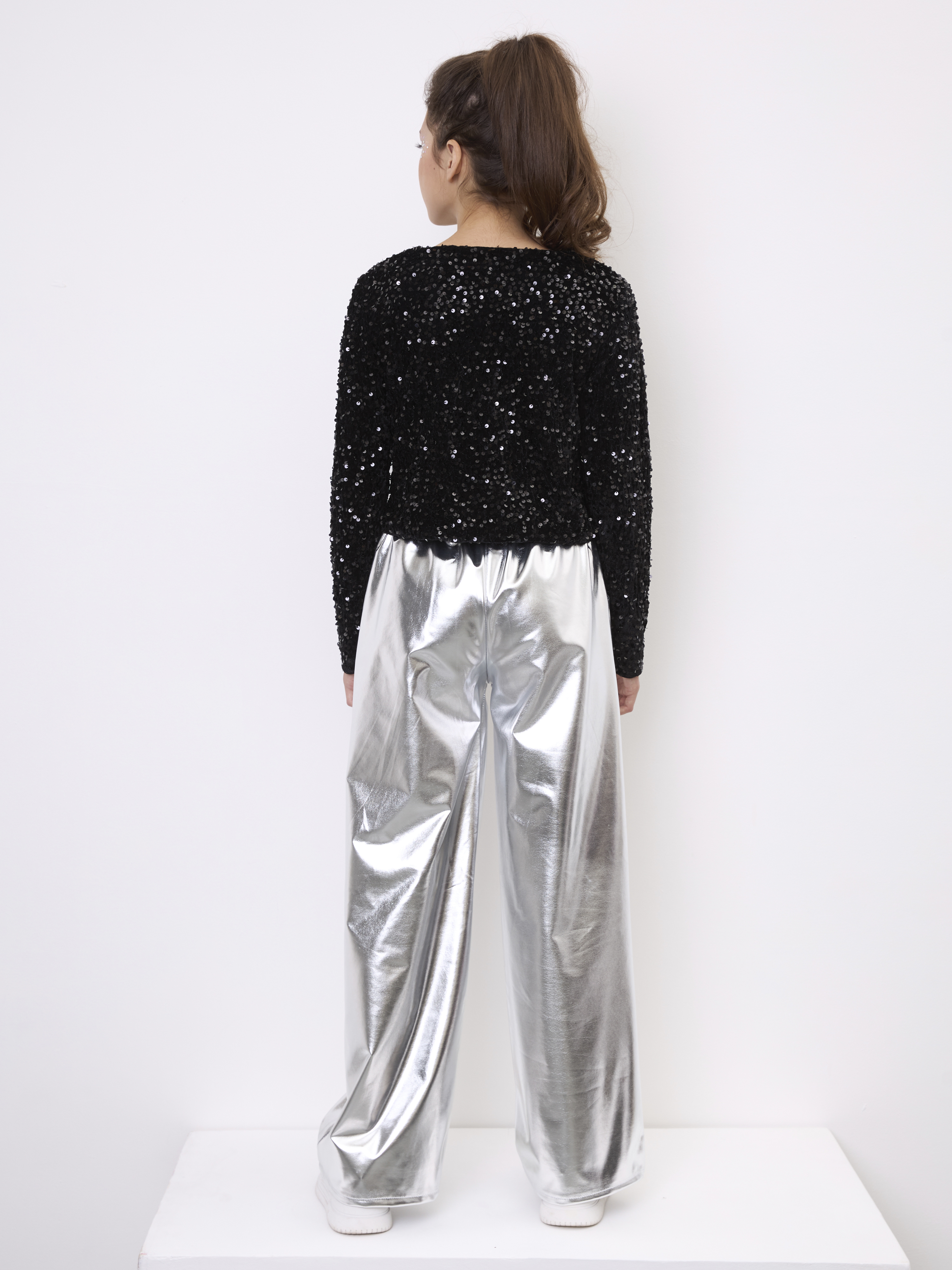 Праздничный костюм для девочки с брюками цвета металлик и кофтой с пайетками. Данный праздничный комплект отлично подойдет для любого рода мероприятий: на новый год 2026, на день рождения, на выступление или на выпускной. Сочетание модных цветов делает данной изделие трендом этого года и с ним ребенок будет в центре внимания любого мероприятия. Блестящие пайетки отлично украшают укороченный жакет с длинным рукавом, а брюки ярко и блестяще подчеркивают образ. Данный костюм будет отличной альтернативой для тех, кто ищет праздничный комбинезон для девочки. Серебристые брюки палаццо в стиле металлик и праздничная кофта - две идеальных составляющих костюма. Брючный костюм отличный вариант полноценного образа на праздник.